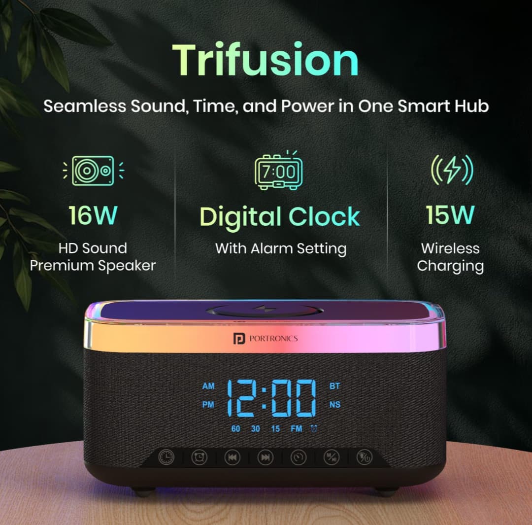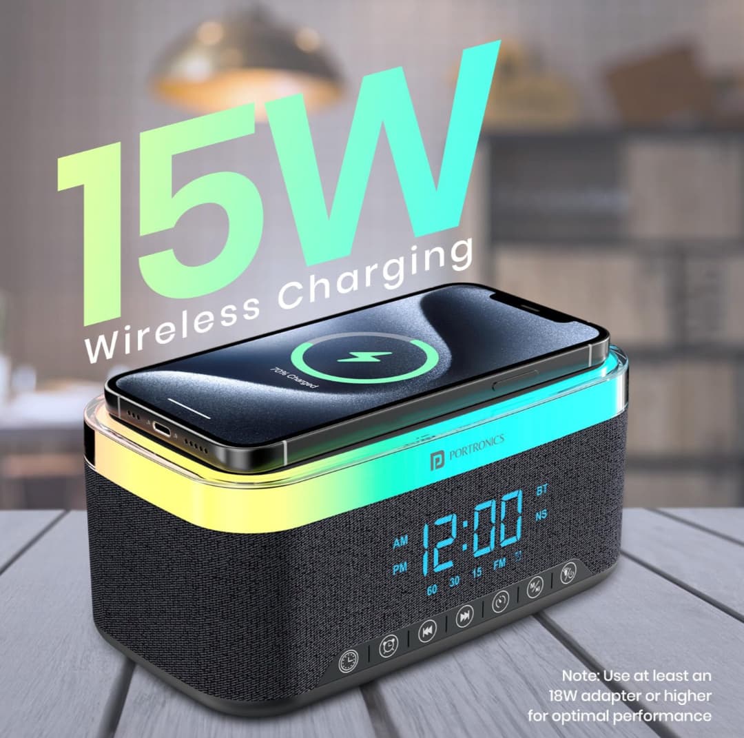 16W HD Sound Bluetooth Speaker with 15W Wireless Charging, RGB LED Lights & Digital Clock – Black