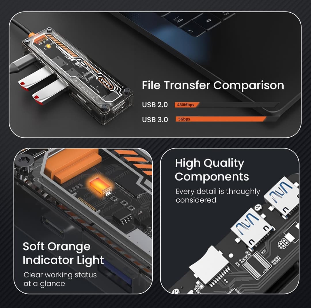 Enhance your connectivity with this 6-in-1 USB Type-C Hub, designed for laptops, desktops, and other USB-C devices. With a sleek transparent case, it combines style and functionality for professionals, gamers, and creators.
