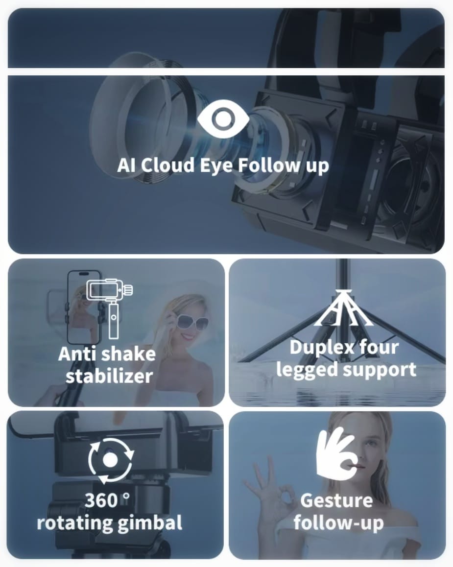 C16 is a next-generation tool for creators, vloggers, and social media enthusiasts. With gesture control, 3-axis stabilization, and 360° face tracking, it keeps you centered and delivers smooth, pro-quality videos without a cameraman.