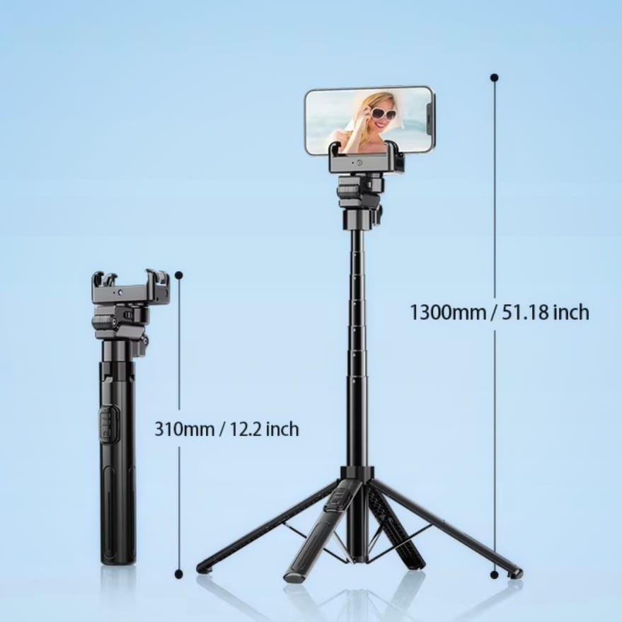 Lightweight and foldable, it works as both a selfie stick and tripod, supports vertical or horizontal shooting, and pairs easily via Bluetooth. A long-lasting rechargeable battery makes it perfect for travel, live streaming, fitness content, and everyday moments.