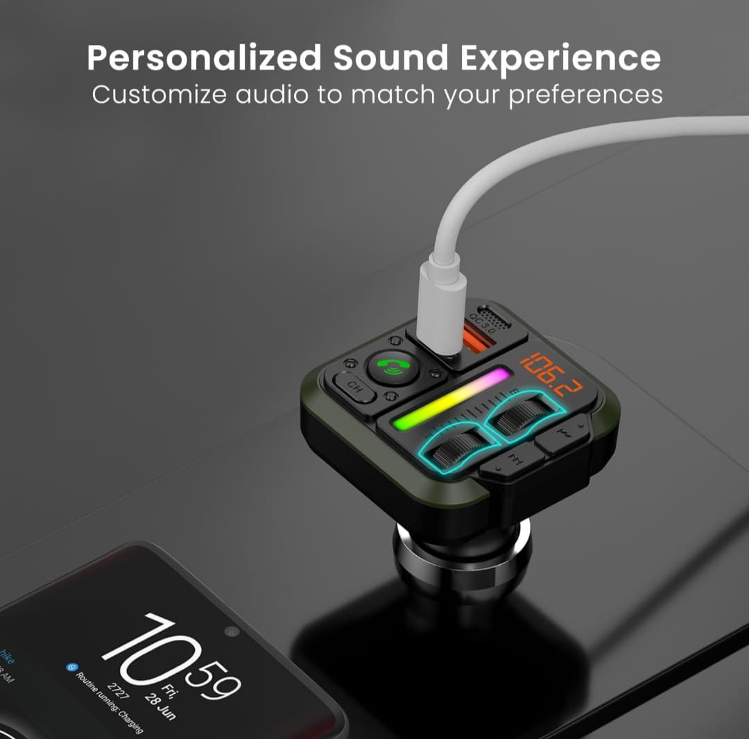 Car Bluetooth Receiver with Hands-Free Calling & Music Streaming | Dual Port Fast Charging, Bass & Treble Control, Dynamic Lighting Effects – Black