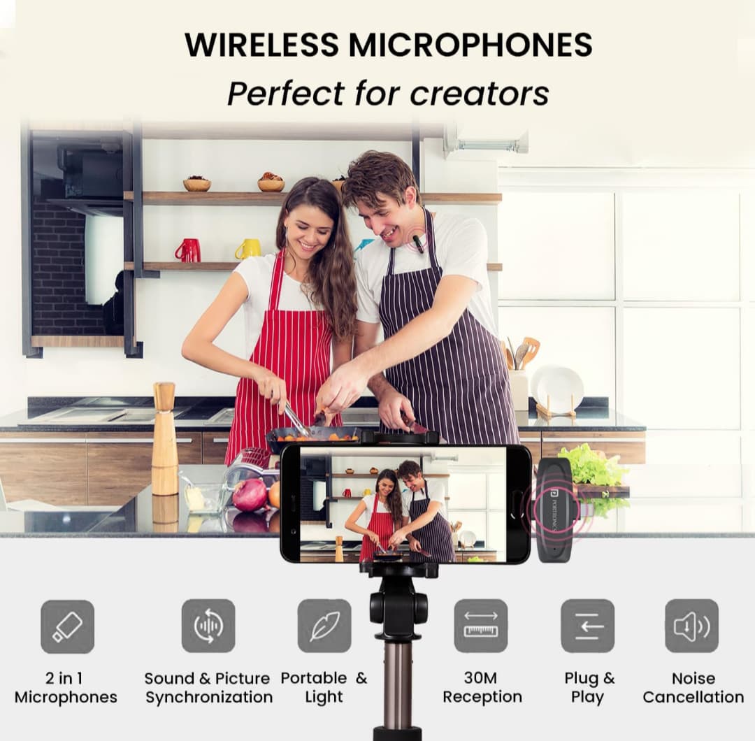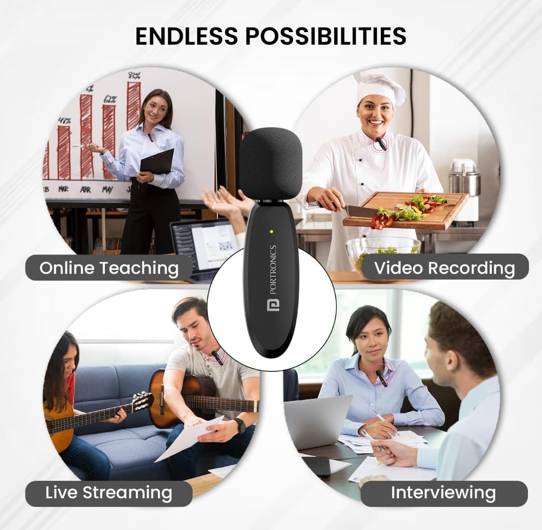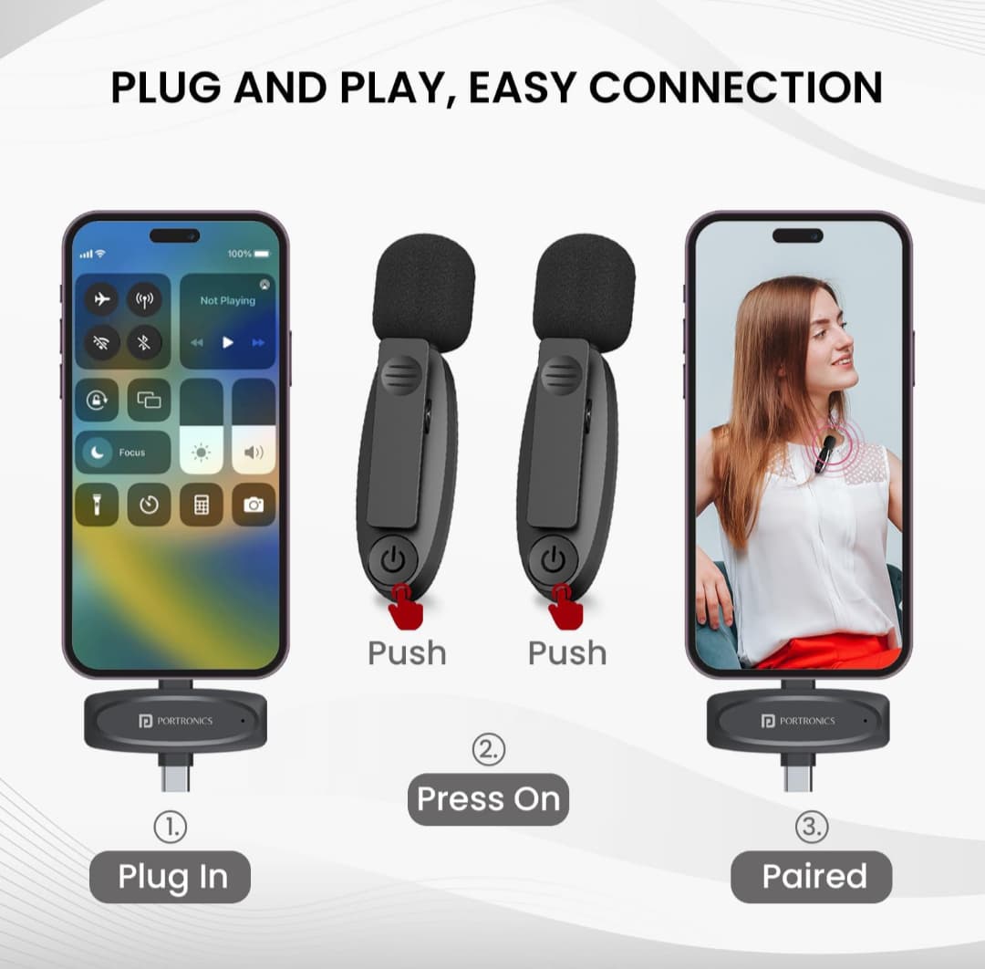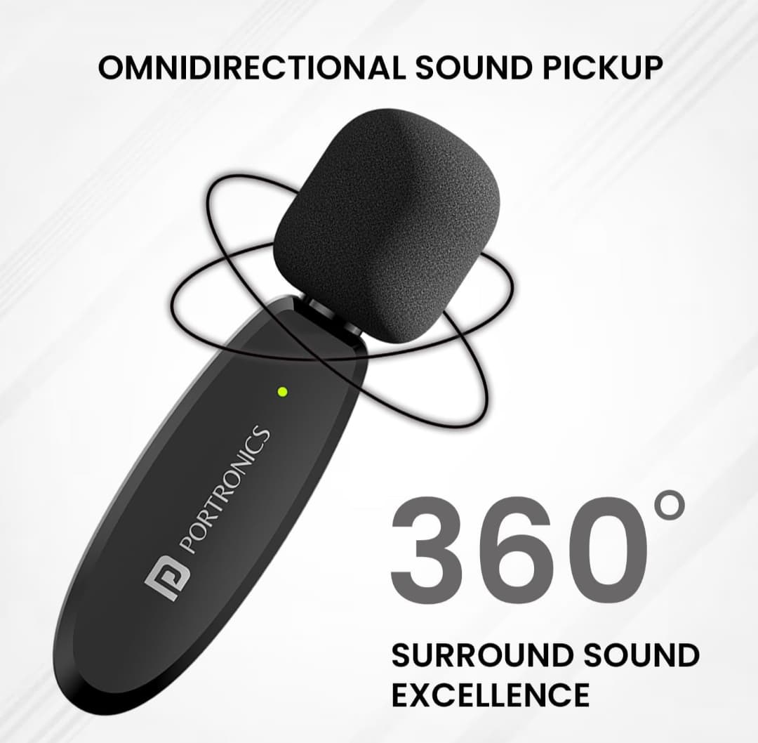 The Portronics Vlogmate Dual Mic is a compact, dual wireless microphone designed for vloggers and content creators. With 2.4G technology, 360° omnidirectional pickup, and noise cancellation, it ensures clear, lag-free audio for videos, interviews, and live streaming.