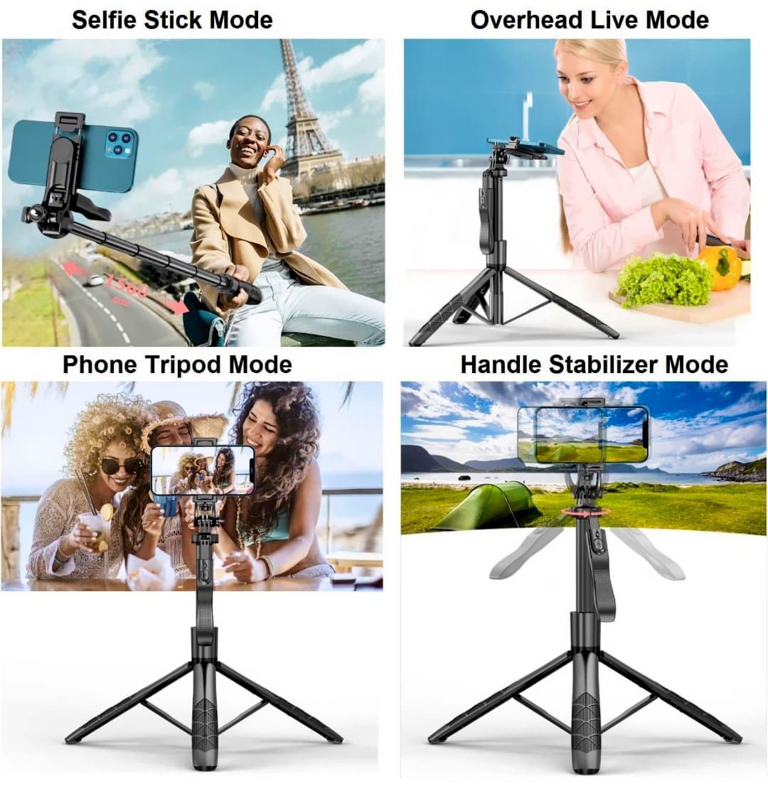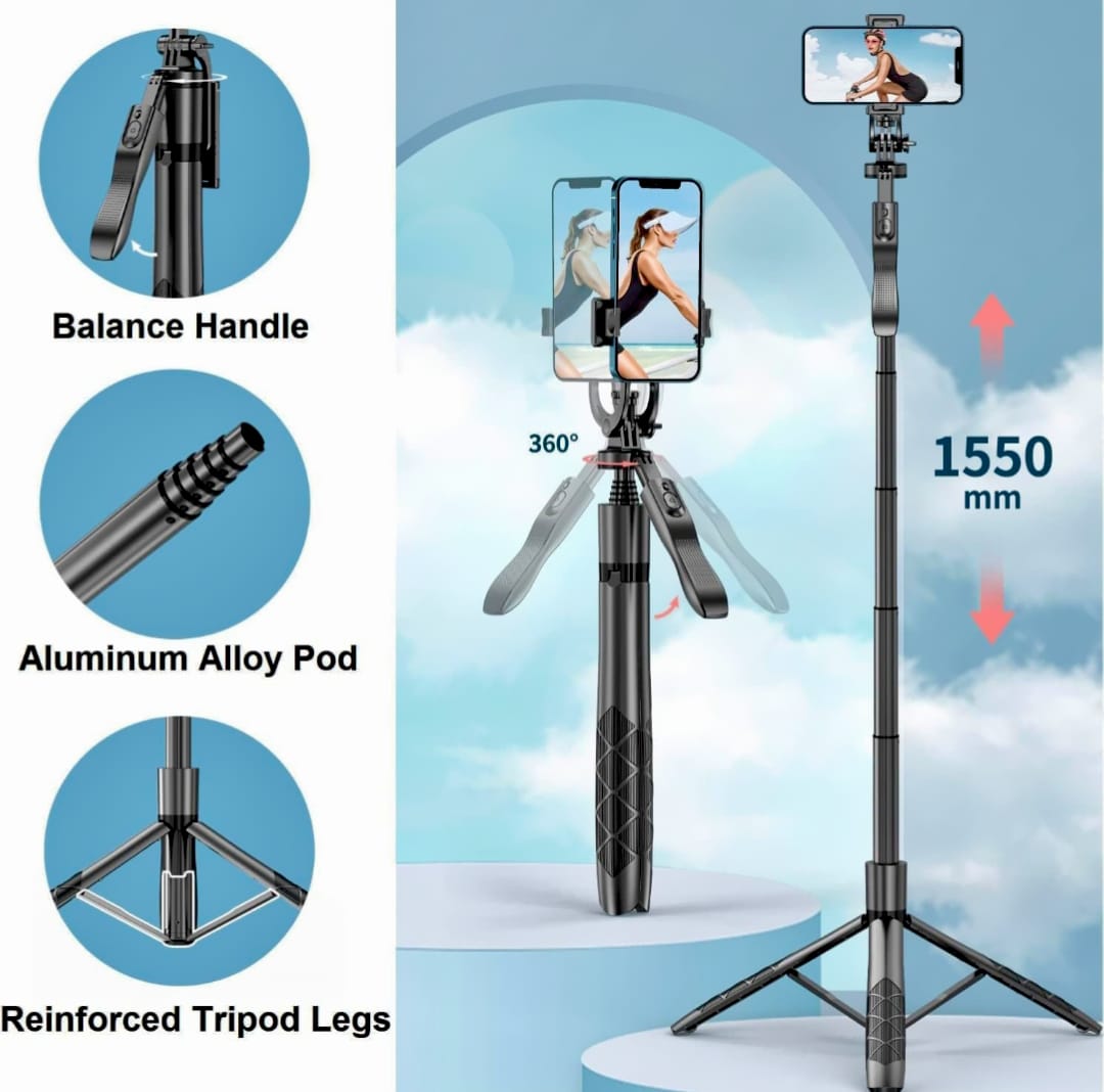 L16 is an all-in-one selfie stick and tripod with a Bluetooth remote, 360° rotating phone holder, and a height-adjustable stand that extends from 13.2" to 60" (152 cm).